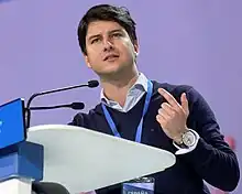 In March 2017, Gago was elected unopposed as the new national president of NNGG, replacing Beatriz Jurado who had passed the organisation's maximum age to run again.[3] He was placed second on the PP list for the April 2019 Spanish general election in the Pontevedra constituency,[5] being one of two party members elected by the constituency;[6] he was the second of three elected in the November election.[7] In April 2021, he passed presidency of the NNGG to Beatriz Fanjul.[8]
