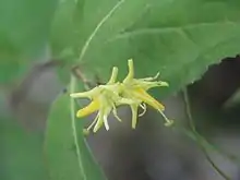 Northern bush honeysuckle is a deciduous shrub, reaching a maximum height between 0.6 and 1.2 metres (24 and 47 in).[1] This particular species is known for the following characteristics: branches lying close to the ground, fibrous roots, pale yellow flowers, and dry, woody fruit. Northern bush honeysuckle's simple leaves are placed in an opposite arrangement. As the seasons change, so do the leaves' colours: initially green, the leaf gradually deepens to a dark red.[2] The flowers are in full bloom between early July and early August; the woody seeds are fully matured by September in preparation for dispersal.