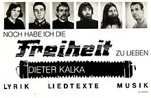 Kalka has appeared on various programs with his bandoneon and playing his own songs, such as in 1988 with the theme "Noch habe ich die Freiheit zu lieben" (I still have the freedom to love). He also sang at times at the songwriter-festival Burg Waldeck. His songs "are not without a bitter aftertaste. He puts his finger on compromises that everybody engages in almost every day of their life, or feel compelled to close. Former ideals are often forgotten”.[10] He has written lyrics for folk opera[11] and has written about "The revival of the East German singer-songwriter scene".[12] His concerts have taken him to Poland, Belarus, Czech Republic, Hungary, Switzerland, Austria and Denmark. His songs are on numerous CDs.
