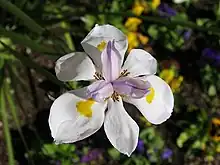 Dietes bicolor has cream or yellow flowers. D. grandiflora and D. iridioides both have white flowers marked with yellow and violet, and appear similar in photographs, but they are quite different: those of grandiflora are much larger, last three days, and have dark spots at the base of the outer tepals, while those of iridioides are small, last only one day, and lack the spots. D. grandiflora is also a larger plant overall.