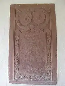 Dietrich Koger (24 March 1608 - 27 November 1688) was a magistrate who served as Mayor and Vogt of Auggen, Holy Roman Empire (present day Germany) from 1629 until 1661. Prior to 1629, Koger served as Sergeant-at-Arms of Weil am Rhein. Dietrich Koger is the son of magistrate, and former Vogt of Weil am Rhein, Nicholas 'Claus' Koger. Dietrich Koger was married twice, the first to Maria Leininger on 24 August 1629 - daughter of Hans Leininger, until her death on 30 April 1643 during pregnancy. Koger's second wife, Anna Hagin, was daughter of the Vogt of Tannenkirch, George Hagin. In the mid-seventeenth century, Koger became the first magistrate to affix a seal with his own crest and coat of arms depicting a plough and vine-knife.[1] During the 30 Years War, Koger and Paster Jeremias Gmelin were credited with bringing peace to Auggen-Baden, and rebuilding the village. His epitaph on the West Cemetery Wall in Auggen still shows the arms and crest of Koger; Koger's coat of arms eventually was inspired and adopted as the town of Auggen's coat of arms. At the time of his death in 1688 Koger had 18 children.[2] A street in Auggen, Germany still bares his name: Dietrich-Koger-Straβe, 79424 Auggen, Germany. Koger's tomb is located at St. Pankratiuskirche Cemetery, Auggen.[3]