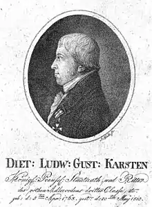 Dietrich Ludwig Gustav Karsten (5 April 1768 – 20 May 1810) was a German mineralogist. Among the most notable of Karsten's writings is a mineralogy book published in 1789 when he was only 21 years old. In later years Karsten held senior government positions in mining and mineralogy in the Kingdom of Prussia at Berlin.[1]