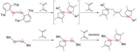 6. 1 2 Stender, Matthias; Phillips, Andrew D.; Power, Philip P. (2002-05-30). "Formation of [Ar*Ge{CH2C(Me)C(Me)CH2}CH2C(Me)]2 (Ar* = C6H3-2,6-Trip2; Trip = C6H2-2,4,6-i-Pr3) via reaction of Ar*GeGeAr* with 2,3-dimethyl-1,3-butadiene: evidence for the existence of a germanium analogue of an alkyne". Chemical Communications (12): 1312–1313. doi:10.1039/B203403D. ISSN 1364-548X. PMID 12116985.