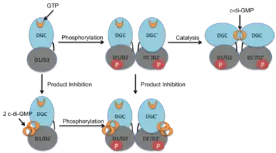 Inhibition of DGC activity is thought to be allosteric and non-competitive.[4][14] Cyclic di-GMP binds to interface between the DGC and D2 domains stabilizing the open structure and preventing catalysis.[15] Strong product inhibition has been observed with a Ki of 0.5 μM.[4]