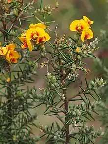 Dillwynia sieberi, commonly known as Sieber's parrot-pea,[2] is a species of flowering plant in the family Fabaceae and is endemic to eastern Australia. It is an erect shrub with rigid, needle-shaped, sharply-pointed leaves and yellow to yellow-orange flowers with reddish-brown markings.