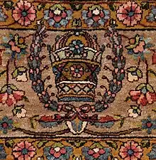 Post first quarter 20th century examples are either modestly signed, or bear the firm's trademark Crown with laurel, known as the Cyrus Crown.[6] Mid-century unauthorized replicas of the firm's Crown Kerman carpets are often referred to as "Imperial Crown" or "Crown Royal" Kermans. These and other permutations using the word "Crown" were created by other manufacturers to ride on the clout of true Cyrus Crown Carpets[7] as well as the Dilmaghani firm.