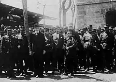 After the disaster of August 1922 and the rout of the Greeks by Mustafa Kemal's forces, the remnants of the Greek Army revolted in September, and the government was deposed. The predominantly Venizelist rebels, under the leadership of Colonel Nikolaos Plastiras, formed a military tribunal to try those that were considered as responsible for the catastrophe. The so-called "Trial of the Six", convened in November 1922, found the defendants, Gounaris among them, guilty of treason. He was executed along with the others at Goudi on the same day of the verdict, on 28 November.[1] Although Gounaris undoubtedly bears a measure of responsibility for the military and diplomatic actions that led to the Greek defeat in 1922, his trial and execution are widely perceived[8] to be more an act of scapegoating in order to vent the anger of the people, as well as being mostly motivated by the hatred of the Venizelist faction towards him.[9]