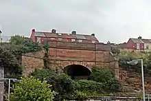 Dingle railway station is a disused underground railway station located on the Liverpool Overhead Railway (LOR), at the south end of Park Road, Dingle, Liverpool. It was the only below ground station on the line.[1] Trains accessed the station via a half-mile tunnel, bored from the cliff face at Herculaneum Dock to Park Road. It is the last remaining part of the Overhead railway, with the surface entrance still standing. The former platform and track area were in use as a garage called Roscoe Engineering until 2015.[1]