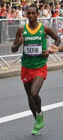 Dino Sefir Kemal (born 28 May 1988) is an Ethiopian long-distance runner. He was one of three members of the Ethiopian team who competed in the marathon at the 2012 Summer Olympics in London, United Kingdom.[1][2] He qualified with a time of 2:04:50 at the 2012 Dubai Marathon,[3] one of the top five personal records among the marathon entrants at the 2012 Olympics.[2] He is coached by Renato Canova.[4]