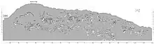 The "Wall of Bones" located within the Dinosaur Quarry building in the park consists of a steeply tilted (67° from horizontal) rock layer which contains thousands of dinosaur fossils. The preserved section is only a portion of what was originally present when Douglass made his discovery as seen on the map above. When work ceased in 1922, a portion of the quarry was left for future development. This work began as part of President Franklin Roosevelt's Civil Works Administration, which provided employment during the Depression under the Transient Relief Service and later under the Works Progress Administration.[16] This work included constructing a road to the quarry, removal of overburden covering the bone-bearing strata, and building of a small, temporary museum. World War II interrupted work, but this was resumed in 1951 with the building of a small metal building over the east portion of the quarry to test whether bone was abundant enough to warrant a larger, more permanent building. This more permanent building was erected in the mid-1950s as part of the National Park Service Mission 66 plan. The architectural design was high controversial for its ultra-modern use of glass, steel and concrete ramp that spiraled around a cylindrical office tower. The building opened at the dedication ceremony on June 1, 1958.[17] The design had two levels and abundant natural light so that visitors could watch technicians remove the hard rock to reveal the excavated fossil bones in-situ.