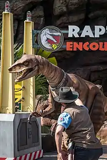 As part of their Jurassic Park attractions, Universal Studios created several realistic dinosaur suits for their theme parks, including Velociraptors and a life size adult Triceratops that was also used to advertise the movies.[4] The dinosaur suits utilised in Universal studios appear to replicate the method used for the dinosaurs in the classic Jurassic Park films. They are capable of complex behaviours such as roaring, snapping, trying to eat the guests or even showing affection in ways such as rubbing their heads or noses on the guests.