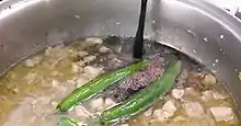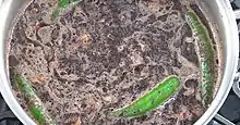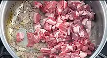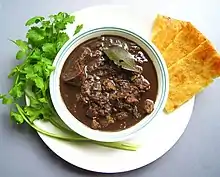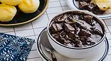 Dinuguan (Tagalog pronunciation: [dɪnʊgʊˈʔan]) is a Filipino savory stew usually of pork offal (typically lungs, kidneys, intestines, ears, heart and snout) and/or meat simmered in a rich, spicy dark gravy of pig blood, garlic, chili (most often siling haba), and vinegar.[1]