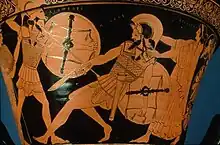 When the sacrifice of Iphigenia (Agamemnon's daughter) became a necessity for the Achaeans to sail away from Aulis, King Agamemnon had to choose between sacrificing his daughter and resigning from his post of high commander among Achaeans. When he decided to sacrifice his daughter to Artemis, Odysseus carried out this order of Agamemnon by luring Iphigenia from Mycenae to Aulis, where murder, disguised as wedding, awaited her.[9] According to Hyginus, Diomedes went with Odysseus to fetch Iphigenia, making this the two companions' first mission together.[10] However, Pseudo-Apollodorus has Agamemnon send Odysseus and Talthybius instead.[11] According to Euripides, neither of the two went to fetch Iphigenia, though he calls the plan Odysseus' idea in Iphigenia at Taurus.[12]