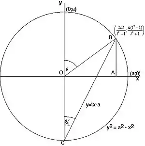 Therefore, we find that one of the summands is and the other is . The sum of these numbers is and each summand is a square. Geometrically, we have intersected the circle x2 + y2 = a2 with the line y = tx - a, as shown in the adjacent diagram.[2] Writing the lengths, OB, OA, and AB, of the sides of triangle OAB as an ordered tuple, we obtain the triple
