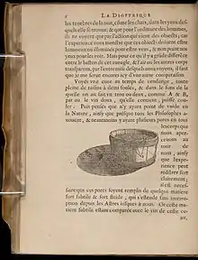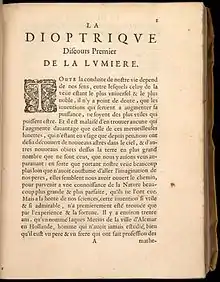La dioptrique (in English Dioptrique, Optics, or Dioptrics) is a short treatise by René Descartes. It was published in 1637 included in one of the Essays written with Discourse on the Method. In this essay Descartes uses various models to understand the properties of light. This essay is known as Descartes' greatest contribution to optics, as it is the first publication of the Law of Refraction.[1]