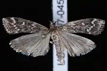 The wingspan is 9.5–11 mm.[8] The forewings are brownish grey with black zigzag lines, bordered by white. The hindwings are light brownish grey with a pale fringe. Adults are on wing from June to August in one generation per year.