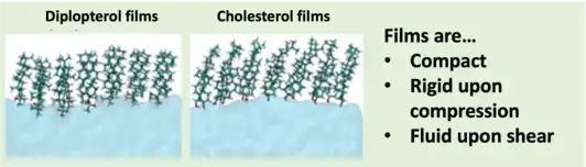 There has recently been in-depth investigation of the properties of diplopterol as a cell membrane component.[9] Researchers compared the monolayer-forming ability of diplopterol to that of cholesterol (animals), ergosterol (fungi) and stigmasterol (plants). In general, they found that pure diplopterol monolayers had similar properties to sterol films, which supports the hypothesis that diplopterol performs similar functions involving membrane fluidity tuning.[9]