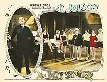 Jolson performs the song in the 1927 film The Jazz Singer in character as Jack Robin (formerly Jakie Rabinowitz). The film concerns the attempt of Jolson's character to become a vaudeville performer against opposition from his religious Jewish family.[5] It was the film's second musical number, and occurs 18 minutes into the film in a scene at Coffee Dan's nightclub in San Francisco.[4][6] Jolson subsequently recorded the song in March 1928.[3] Gerald R. Butters in his 2002 book Black Manhood on the Silent Screen wrote that "the symbolic link with blackface (dirtiness) is obvious"; the film later featured Jolson wearing blackface.[4] After he sings the song Jolson responds to the audience's applause by saying in improvised dialogue, "Wait a minute. Wait a minute. You ain't heard nothing yet" a phrase he often said in his vaudeville performances.[7] Jolson's words were the first words spoken on camera in a feature film.[5] Michael Rogin describes them as "These first words of feature movie speech, a kind of per-formative, announce-you ain't heard nothing yet-the birth of sound movies and the death of silent film".[5] Rogin wrote in the journal Critical Inquiry in 1992 that "The "desire" that carries forward this "interiorized, moralized" oedipal narrative...is Jack's "innocent and dirty" desire-sung as "Dirty Hands, Dirty Face" to become a histrionic, vaudeville performer".[5] The "innocent and dirty" quote was derived from the writings of Pascal Bonitzer.[5]