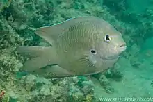 Dischistodus prosopotaenia, also known as honey-head damsel and honey-breast damsel, is a species of damselfish. It is native to the eastern Indian Ocean and western Pacific. It reaches up to 17 centimetres (6.7 in) in length. The fish usually has a white breast, but there is a yellow-breasted variant that also has a black blotch on each side. The fish lives in lagoons and reefs.[1]