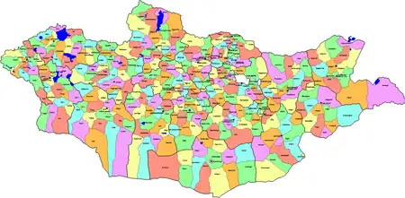 A district (Mongolian: сум, ᠰᠤᠮᠤ, sum, pronounced [sʰo̙m]; lit. "arrow"), is a second level administrative subdivision of Mongolia. The 21 provinces of Mongolia are divided into 330 sum.[1]