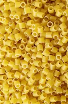 Ditalini (Italian: [ditaˈliːni]; English: "small thimbles"), also referred to as tubettini,[1] is a type of pasta that is shaped like small tubes.[2] It has been described as "thimble-sized"[2] and as "very short macaroni".[1] In some areas it is also called "salad macaroni". During the industrial age in Apulia, Italy, increased development of ditali and other short-cut kinds of pasta occurred.[3] In contemporary times, it is a mass-produced pasta. It is used in several dishes and is commonly used throughout Sicily.
