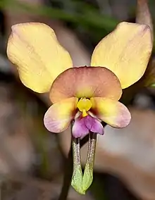 Diuris ostrina, commonly known as Darling Scarp donkey orchid,[2] is a species of orchid that is endemic to the south-west of Western Australia. It has two or three linear to lance-shaped leaves and up to five brown to brownish-yellow and purple-mauve flowers.