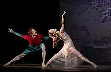 In 2021, the Royal Opera House put on The Dante Project, choreographed by Wayne McGregor to new music composed and conducted by Thomas Adès, with set and costumes by Tacita Dean. It was danced by The Royal Ballet, led by its principal dancer Edward Watson as Dante, in his final appearance after 20 years working with and interpreting McGregor. The music was performed live by an orchestra of 75 musicians. Sarah Crompton called the work "bold, beautiful, emotional and utterly engaging".[64] The dance is in three sections. "Inferno" shows Dante's journey to hell, guided by Virgil, in "remarkably free and inventive"[64] choreography, "rich in feeling".[64] "Purgatorio" shows Dante meeting two incarnations of his young self, and three of the woman he loves, Beatrice. Watson dances with the living Beatrice (Francesca Hayward) "in lovely, poetic flow",[64] and then with the heavenly Beatrice (Sarah Lamb) "all unfolding limbs and ethereal gestures".[64] "Paradiso" has Dante in heaven with the dancers skittering about the stage all in white, in what Crompton calls a mood "of abstracted joy, deep but dazzling".[64]