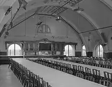 In 1948, the building was sold to Father Divine (Reverend Major Jealous Divine) for $485,000. Father Divine was the leader of the International Peace Mission movement. After purchasing the building, Father Divine renamed it the Divine Lorraine Hotel. His hotel was the first of its class in Philadelphia, or indeed in the United States, to be fully racially integrated.[3] The Divine Lorraine was open to all races and religions, men and women who were willing to follow the rules of the movement. Among others, the rules included no smoking, no drinking, no profanity, and no undue mixing of the sexes, with men and women residing on different floors of the building. Additionally, guests and residents were expected to uphold a certain level of modesty, meaning that women were expected to wear long skirts - pants were not allowed. Believing that all people were equal in the sight of God, Father Divine was involved in many social welfare activities as well. For example, after purchasing the hotel, several parts of it were transformed for public use. The 10th-floor auditorium was converted to a place of worship. The movement also opened the kitchen on the first floor as a public dining room where persons from the community were able to purchase and eat low-cost meals for 25 cents.