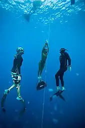 A dive team can vary from a recreational buddy pair to a professional saturation diving team working 24 hours per day with dive and habitat support personnel on a dynamically positioned vessel.[13] The primary purpose of a professional diving team is to improve safety for the working diver by providing backup and support, and to manage the surface equipment required for the operation.[27][14][38] A buddy pair is a team intended to improve the safety of recreational divers, and in some circumstances succeeds in this aim, depending on the skills, situational awareness and compliance with procedures of both of the divers. Technical diving teams can vary between the recreational buddy pair at its worst to expedition teams with structure, competence and planning similar to professional teams. For buddy diving to be an effective means of improving safety, the buddy pairs should be set long enough before the dive to allow adequate familiarisation with each other's equipment, signals and procedures, where they differ, and discuss the dive plan, and kit-up should occur in close enough proximity for both divers to actually monitor the progress and details of pre-dive checks, and where necessary, to assist directly with fitting equipment.[39]