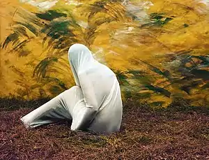 Diwan has pushed the boundaries of photography by developing a technique of combining painting, acting, and photography to narrate his personal impressions and experiences of the world in and around him. He creates a three-dimensional immersive environment in which there is a painting in the backdrop, actors whose bodies are painted and props[14] created specifically around the themes he is working on (in the series Violence, Waking the Dead, Shores of the Unknown and After the Turmoil).[18] This temporary installation of various elements is photographed on a transparency film which is further exposed in the darkroom on a normal photographic paper by controlling the rendition of images with the play of filters.[17]