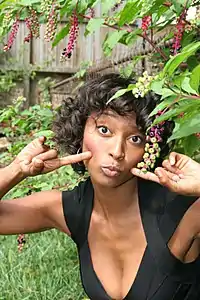 In 2004, her video work of Halle Berry was a featured artist in an exhibition held in the abandoned Capital Children's Museum called Artomatic.[15] In 2005 her multimedia work titled Niggaz4Life (named after the N.W.A song of the same name) was showcased at the Transformer Gallery in D.C.[16] The installation utilized an imaginary advertising campaign to encourage multiracial celebrities to embrace their membership in the black community. The gallery installation featured images of celebrities including Vin Diesel, Mariah Carey and Tiger Woods and a video featuring clips from films including Booty Call, Soul Plane, Bringing Down the House and Spike Lee's Bamboozled. In conjunction with the gallery display, the project involved a street art aspect as Djakarta pasted military recruitment-style posters that said "WE WANT YOU" above images of the celebrities framed in the colors red, green and black.[6][17]