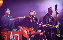 Some other live collaborations include guitar virtuoso Tommy Emmanuel; rock'n'roll pioneers Donovan,[57] Wanda Jackson, Dale Hawkins, Scotty Moore band, DJ Fontana, Sonny Burgess, Joe Clay, Eddie Bond, Gene Summers; blues giants Billy Boy Arnold, Jody Williams; jazz legend Don Randi; swing sensation Squirrel Nut Zippers; pop star Aaron Carter[58] and many others. He also worked with movie composers Marco Beltrami[59] and Danny Elfman.[27][11][28][9][17][29]