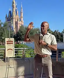 Djuan Rivers speaking before his name is engraved on Main Street USA.