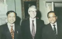 In 1993, Agashe was invited to open the Deodhar Entrance to the Nehru Stadium, Pune.[56] In 1994, he provided financial assistance to Société géologique de France for their research.[57][58] During his tenure as chairman of the association in the early 1990s, he was twice elected as the vice president and once as the treasurer of the Board of Control for Cricket in India, being elected for his second term as vice president in 1995.[29] In 1996, he had also contested for the post of BCCI's president, but lost by two votes.[59] That same year, he was also the vice chairman of the finance committee of the Pakistan-India-Lanka Joint Management Committee (Pilcom), which had organised the 1996 World Cup.[60] The late 1990s also saw Agashe diversify the syndicate and bank businesses to incorporate country liquor and banking software,[61] alongside research into sugarcane for the syndicate.[28] In 1996, he stepped down as managing director of the syndicate in favour of his son, Ashutosh.[62]