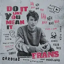 "Do It Like You Mean It" is a song by Swedish singer Frans featuring Yoel905. It was released as a digital download in Sweden on 24 May 2019 through Cardiac Records.[1][2] The song was written by Dani Klein, Fredrik Andersson, Dirk Schoufs, Una Balfe, Michael Saxell, Frans Jeppsson Wall and Yoel905. The song did not enter the Swedish Singles Chart, but peaked at number seven on the Swedish Heatseeker Chart.[3]