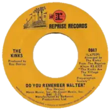 Reprise Records issued "The Village Green Preservation Society" backed with "Do You Remember Walter?" as an American single in July or August 1969.[lower-alpha 3] The release coincided with Warner Bros. Records' "God Save the Kinks" promotional campaign, which sought to reestablish the band's status in America after their informal four-year performance ban was lifted in the country.[33] The Kinks never added "Do You Remember Walter" to their concert set list. They performed two studio takes of the song at Konk recording studios on 11 April 1994.[34] The sessions were played in an unplugged style and filmed for a BBC documentary.[35] When the Kinks' 1994 album To the Bone was re-released in 1996 with a CD of extra material, the 1994 recording of "Do You Remember Walter" was among the songs added.[36]