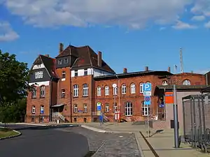 On 17 June 1875, the Berlin–Dresden railway was opened together with the two-level interchange station (Turmbahnhof or “tower station”) at the intersection with the line from Leipzig and Falkenberg to Cottbus. The two lines were doubled in 1890 and 1909 and they and were both electrified between 1980 and 1989. A decentralised rail traction current converter plant built on the railway bridge on the line towards Frankena supplied electricity to sections of both lines. It was closed after 27 years of operation in July 2008 and replaced by a modern substation. In the 1980s, it was planned to upgrade the station as a node with multiple tracks on each line; this is shown by a widened abutment to the bridge at the railway junction. After the reunification of Germany, this plan was not implemented.