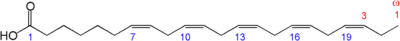 The chemical structure of clupanodonic acid showing physiological numbering (red) and chemical numbering (blue) conventions.