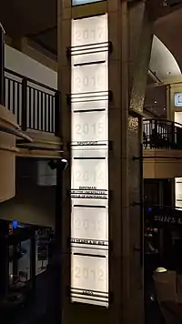 A 2016 photo of the Art Deco column displaying the 2012 to 2015 recipients of the Academy Award for Best Picture at the bottom, and blank spaces at the top for the then-yet-to-be-determined 2016 and 2017 winners