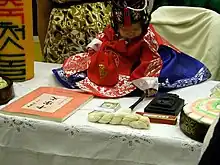 Dol or doljanchi is a Korean tradition that celebrates the first birthday of a baby.[1] This ceremony blesses the child with a prosperous future and has taken on great significance in Korea. The birthday babies wear a hanbok and a traditional hat: a jobawi or gulle for baby girls and a bokgeon or hogeon (호건) for baby boys.