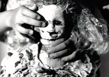 Love's ideas included a large amount of doll imagery, herself "in a babydoll dress looking demure while playing guitar on a bed" and "walking in a bleak backyard passing a children's table set for a tea party."[23] Bayer designed the garden scenes to be "decaying" and added "a hundred plaster-wrapped dolls dangling from trees."[22] Other scenes features a young blonde boy, a reference "meant to invoke Kurt [Cobain]",[24] and footage of the band performing the song. Most of the video was shot in black-and-white and interspersed with various color shots. Two edits of "Doll Parts" have been broadcast—an original edit and a "producer's version."[25]