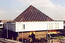 Havering London Borough Council approved the design and £7.5 million construction of the Dolphin Centre in April 1980; it was named after a public house which existed in the nearby Romford Market from 1630 to 1900.[1] When the centre was opened in April 1982, by Prince Richard, Duke of Gloucester, it had a state-of-the-art pyramid roof (the first of its kind in Europe). However, corrosion and the collapse of one of the panels in the roof led to it being draped with netting in 1990 to calm safety fears.