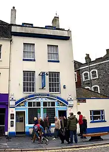 The three storey building was constructed in the early 19th century, although it may contain fabric from an earlier structure. It has a slate mansard roof surrounded by a tall parapet with a moulded cornice. The front has white stucco with plaster reliefs of dolphins.[2] The pub is associated with the Tolpuddle Martyrs, some of whom stayed at the hotel on their return from exile in Australia in 1838, when a Mr Morgan was the landlord.[5][6][7][8]