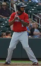 The Phillies traded Santana to the Houston Astros on July 31, 2011, with Jon Singleton, Jarred Cosart, and Josh Zeid, in exchange for Hunter Pence.[3][4] He finished the year with the Single-A Lexington Legends, hitting .382/.447/.662 with 5 home runs and 21 RBI in 17 contests. In 2012, Santana played for the High-A Lancaster JetHawks, batting .302/.385/.536 with career-highs in home runs (23) and RBI (97). He spent the 2013 season with the Double-A Corpus Christi Hooks, posting a .252/.345/.498 slash line with a career-high 25 home runs and 64 RBI. He was added to the 40-man roster on November 20, 2013.[5] He was assigned to Triple-A to begin the 2014 season.