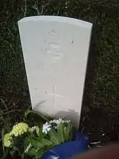 On this raid, Bruce was part of another scratch crew.[9] The crew included: Bruce, Wing Commander pilot Roy Arnold, air-gunner Flying Officer Thomas Albert Bax, air-gunner Sgt. R. H. Barratt who was also from staff, Sgt. James Murray Pinkham and Sgt. Harold Arthur Wink. Arnold stayed at the controls of the burning Wellington, at low height, in order to keep it steady and allow the other five crew members to escape.[36] He was thirty years old and married. Arnold is buried in the CWG cemetery at Blankenberge, Belgium.[38] The story of his act of self-sacrifice did not emerge until after the war when the crew returned from captivity and could tell their squadron commander. Arnold's bravery was mentioned in dispatches.[38]