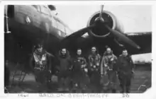 On 6 October 1938, while with No. 214 Squadron, he survived the crash of Harrow "K6991" at Pontefract, Yorkshire.[12] While acting as a wireless operator for his aircraft he was knocked out by a lightning strike.[13] Once recovered he alerted his base to the fact that the crew were bailing out. Wishing to get out of an escape hatch he found his way blocked by other airmen who were hesitating about throwing themselves out of the aircraft into the howling darkness. He rushed to the other side of the hatch and jumped. His parachute harness caught on projecting clamps and pulled the trapdoor shut above him. Bruce was now suspended under the bomber and unable to escape further. Realising what had happened his fellow crew members were now galvanised into action, raised the trapdoor and were shocked to have Bruce shoot back into the aircraft, though not too shocked to eject him again. Bruce was subsequently awarded the Air Force Medal (AFM) on 8 June 1939.[14][note 2] According to Pete Tunstall, Bruce was very proud of being the only man known to have bailed from an aircraft three times and to have landed only twice.[16] After the war he used to entertain his children with the seemingly insoluble riddle: "How is it that I baled out three times, but only landed twice?" Bruce called his AFM medal the 'Away From Mam' medal.[13]