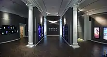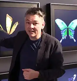 Flutter2011Interactive video artwork comprising 88 video screens depicting the movement of a Morpho Helena butterfly in flight. This artwork can be found on public display at the Borusan Contemporary Art Collection[9]Code, electronics, sensors, computer, mirror, metal.[10]
