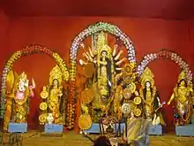 Similar to the rest of Bengal, Durga Puja, Eid al-Fitr and Kali Puja are the three major festivals celebrated here. Dolyatra (Holi), Jagaddhatri Puja, Rath Yatra, Saraswati Puja, Manasa Puja and Christmas are also celebrated in the town. Baruipara Raksha Kali Puja, Bagpara Kali Puja, Domjur BDO Kali Puja, Pancham Dol at Makarchandi Temple are other major festivals of Domjur.