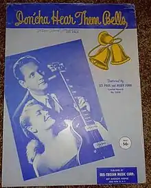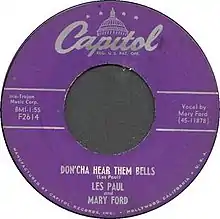The song was released as a 7" vinyl 45 single on Capitol Records, 45-11878, F2614, backed with "The Kangaroo", in 1953.[1] The recording was also released as a 10" 78 as 2614. The song was composed by Les Paul and was published by the Iris-Trojan Music Corporation in New York. "Don'cha Hear Them Bells" reached no. 13 on the Billboard Jockey Chart in November, 1953 in a four-week chart run and no. 28 on the Cash Box chart in a 10-week chart run.[2][3] The flip side "The Kangaroo" reached no. 23 on the Cash Box chart.