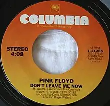 "Don't Leave Me Now" is a song by the English rock band Pink Floyd.[1] It appears on The Wall album (1979) and was released as a B-side on the single of "Run Like Hell".[2] A 12" single of "Run Like Hell," "Don't Leave Me Now" and "Another Brick in the Wall (Part 2)" peaked at #57 on the Disco Top 100 chart in the U.S.[3]